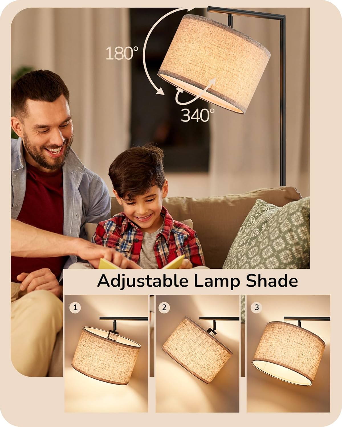 Easy to Install & Pedal Switch – No tools needed, just tighten the base, tubes, lampshade, socket ring, and E27 bulb clockwise; an ON/OFF foot switch for convenient use; No need to bend down to turn the living room lamp ON/OFF; perfect for the elderly or those with waist and back discomfort