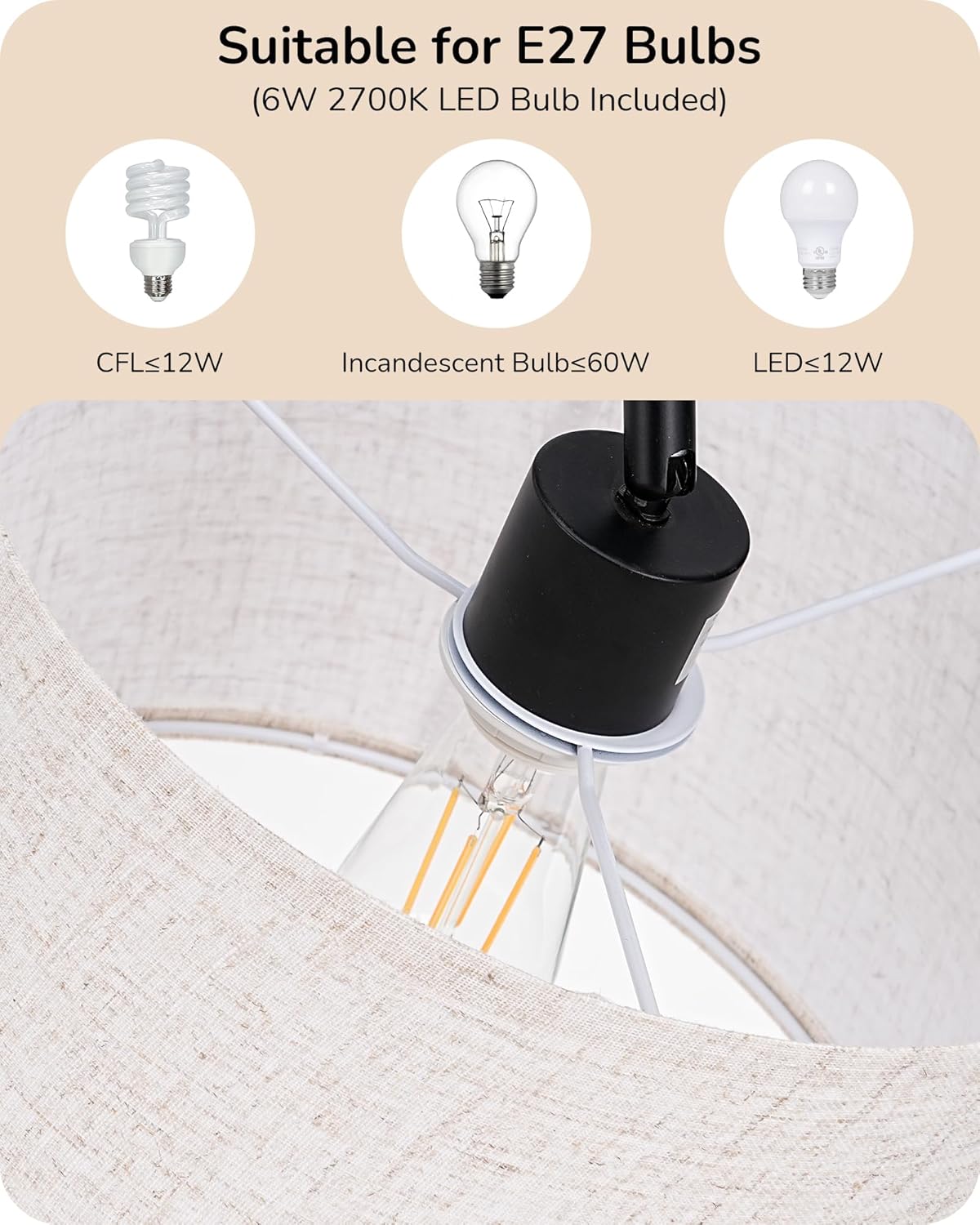 E27 Socket – Bulb Included, Compatible with E27 Base Bulb. Max load power 60W Incandescent Bulb/12W LED Bulb, you can also choose the bulb that suits your preference; the standard lamp’s cord, plug, switch are UKCA listed, nationally recognized for the standard of safety