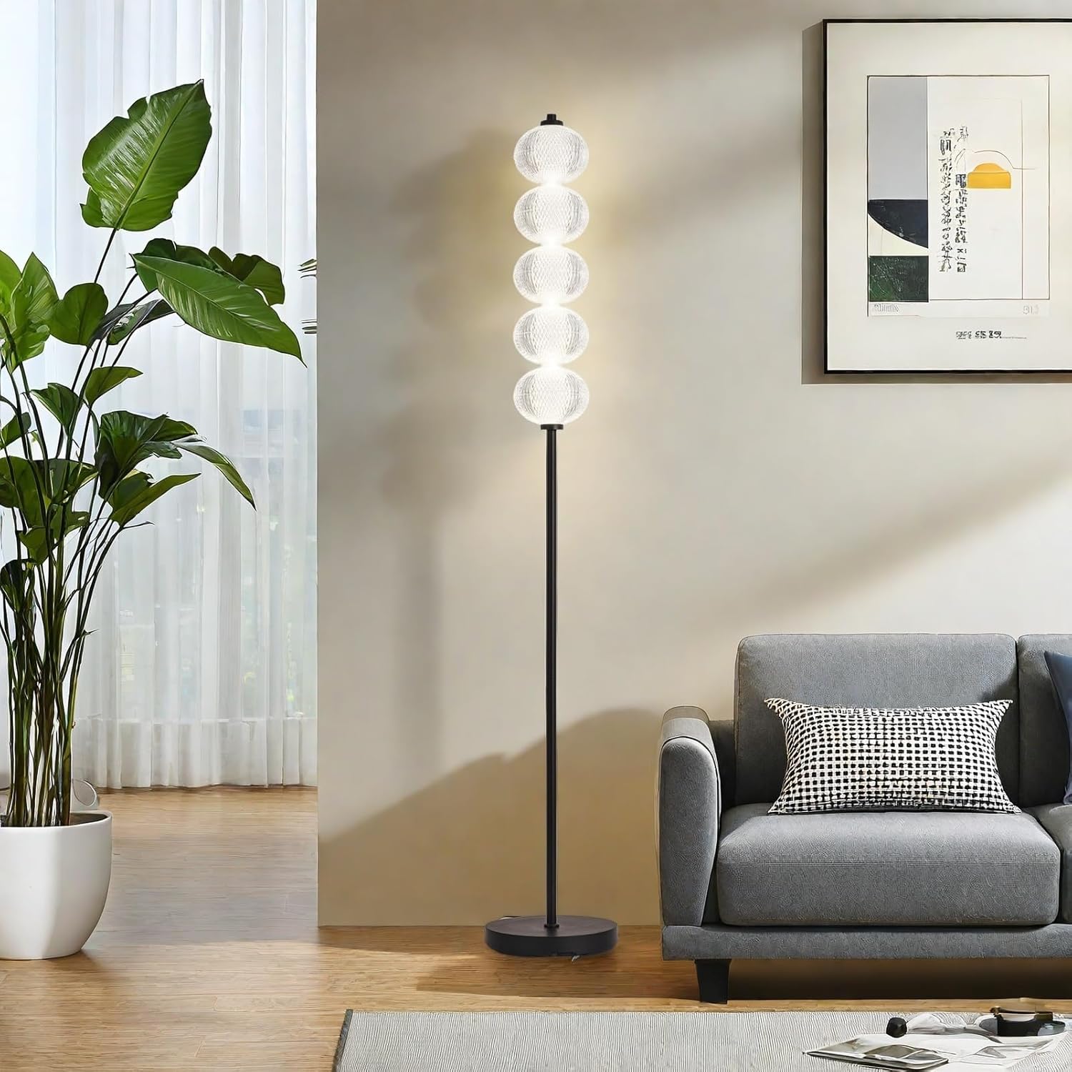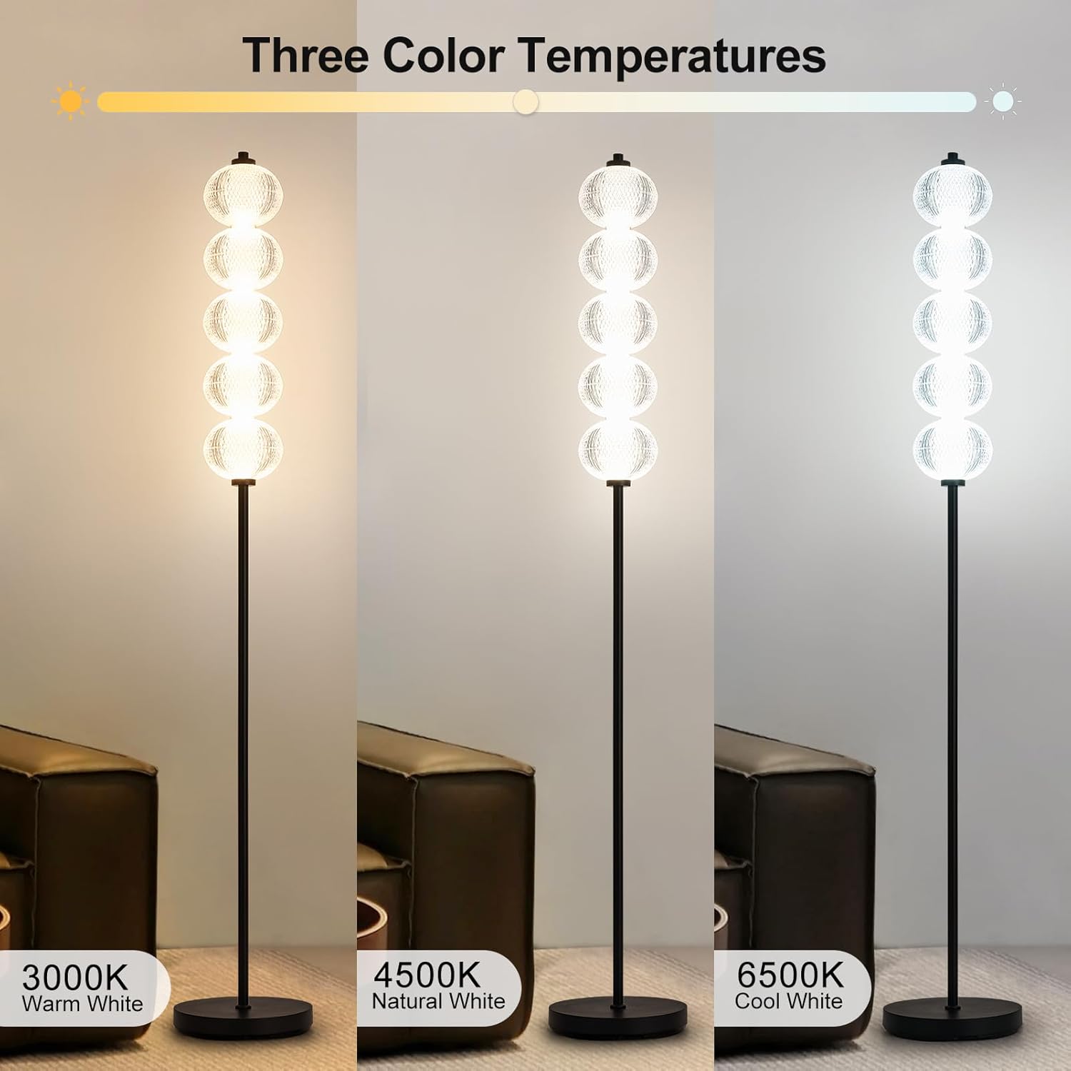 Elevate your space with the HARPER LIVING 160cm LED Floor Lamp, featuring 360° omni-directional lighting from its cylindrical LED bulb (2400 lumens at only 20W). The foot remote lets you effortlessly switch between 3000K (warm), 4500K (natural), and 6500K (cool white) light. Its 5 globe textured shades and polished black finish add luxury to any decor, while the 2.35m cable offers flexible placement. Perfect as a reading lamp by sofas, bedside lighting, or living room centerpiece.
