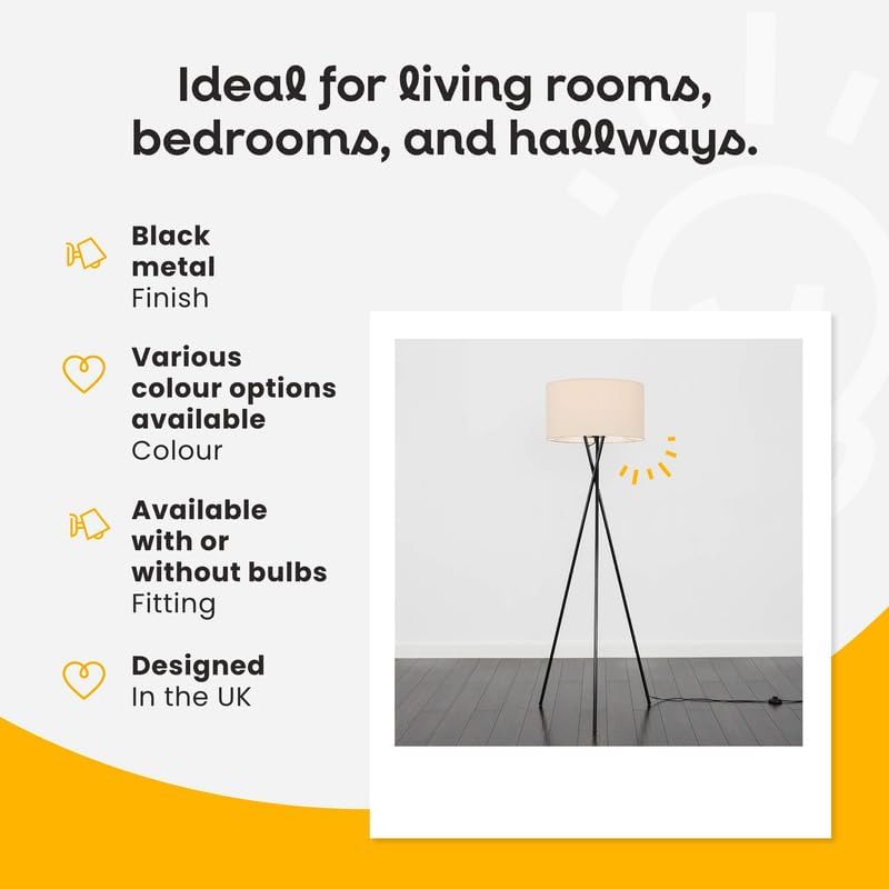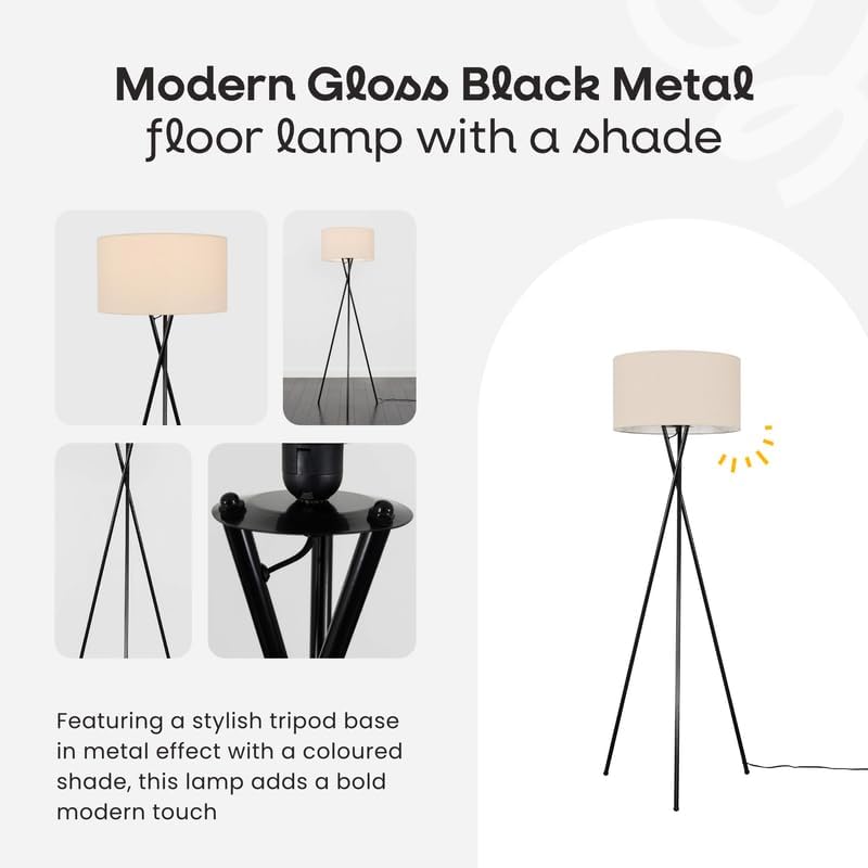 FLOOR LAMP – Update your living space with the latest trends in lighting with this Modern Gloss Black Metal Tripod Floor Lamp with a Pale Grey Shade. Mixing quality materials and stylish designs, our range of products are perfect for adding a modern style to your home.